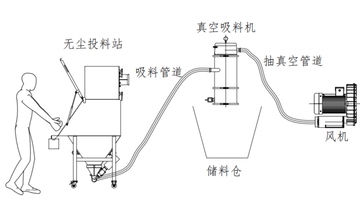 無塵投料站的工作原理是投料時產(chǎn)生的物料粉塵被離心風(fēng)機(jī)或抽氣管道形成的負(fù)壓吸到過濾系統(tǒng)中,使物料與空氣分離,防止粉塵四散逃逸、污染周圍環(huán)境和保護(hù)操作者身體健康。